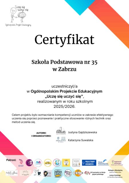 W roku szkolnym 2025/2026 w Szkole Podstawowej Nr 35 w Zabrzu od października do lutego zrealizowano ogólnopolski projekt edukacyjny „Uczę się uczyć się”. Program był skierowany do uczniów klas 1-3 […]